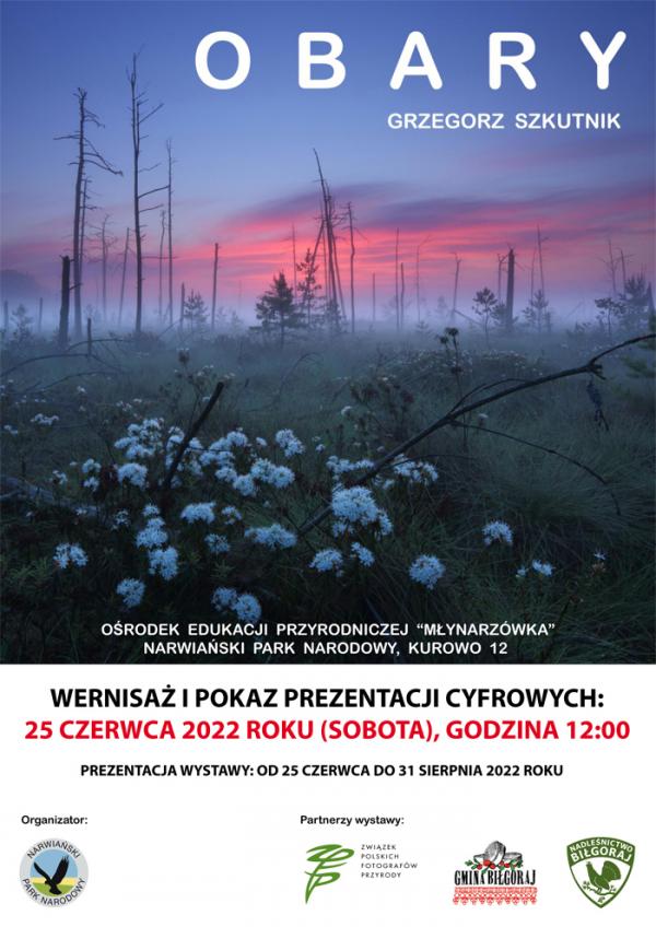 [ Czytaj całość ]Zapraszamy na kolejną, już dwunastą prezentację wystawy Grzegorza Szkutnika pt. "Obary". Wernisaż odbędzie się 25 czerwca o godzinie 12:00 w Ośrodku Edukacji Przyrodniczej "Młynarzówka" Narwiańskiego Parku Narodowego w Kurowie. Na wystawie przygotowanej z okazji 45 rocznicy objęcia ochroną naturalnych fragmentów torfowisk przejściowych i wysokich typu subkontynentalnego znajdujących się w zachodniej części lasów Puszczy Solskiej zaprezentowanych zostanie 20 fotografii w formacie 82x55 cm w oprawie 100x70 cm. Prace przedstawiają charakterystyczne elementy krajobrazu rezerwatu przyrody "Obary" sfotografowane w zastanych warunkach na przestrzeni czterech pór roku. Wykonane zostały w latach 2012-2019 w okresie obowiązywania stosownego zezwolenia umożliwiającego autorowi poruszanie się w obszarze chronionym oraz fotografowanie przyrody. Podczas wernisażu odbędzie się pokaz prezentacji cyfrowych. Wystawa powstała dzięki wsparciu: Związku Polskich Fotografów Przyrody, Nadleśnictwa Biłgoraj i Gminy Biłgoraj. Ekspozycja potrwa do 31 sierpnia br.