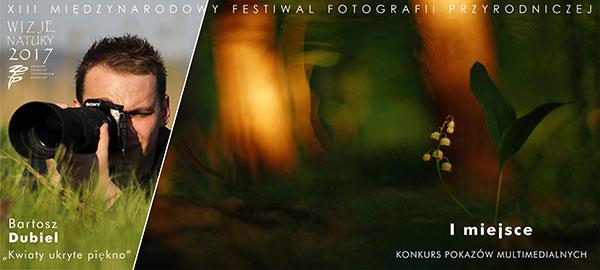 W konkursie pokazów multimedialnych podczas XIII Międzynarodowego Festiwalu Fotografii Przyrodniczej „Wizje Natury 2017”, który odbył się w Izabelinie w dniach 18-19 listopada 2017 r., nasz kolega Bartosz Dubiel zdobył aż 3 nagrody: I miejsce za pokaz pt. „Kwiaty - ukryte piękno” II miejsce za pokaz pt. „Bieszczadzka półmroczność” wyróżnienie za pokaz pt. „Historia pewnego lasu”. Gratulacje dla Bartka.